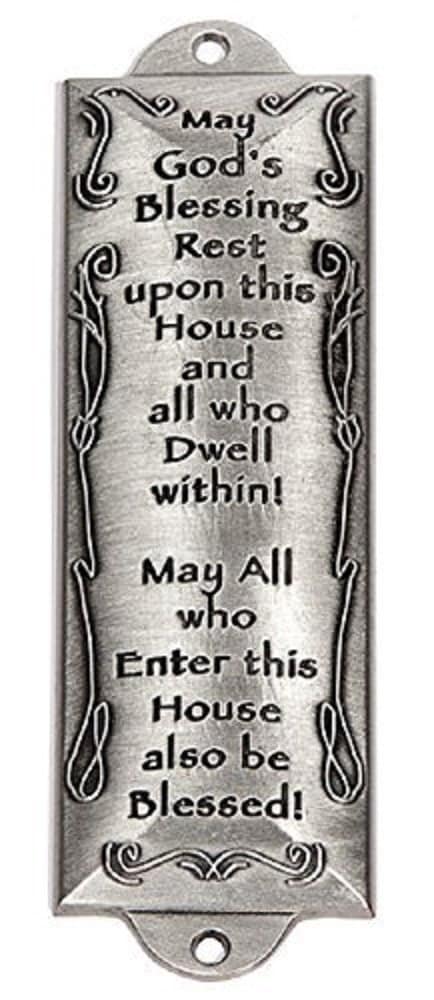 Pewter mezuzah in brushed finish with words of blessing for all and raised swirl trim