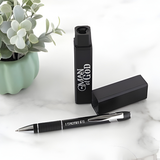 The 1 Timothy 6:11 Gift Pen has the text of the 1 Timothy 6:11 verse reference screen-printed on the black pen’s barrel in silver and also comes packaged in an elegant brown gift box with “Man of God” text displayed in gray.