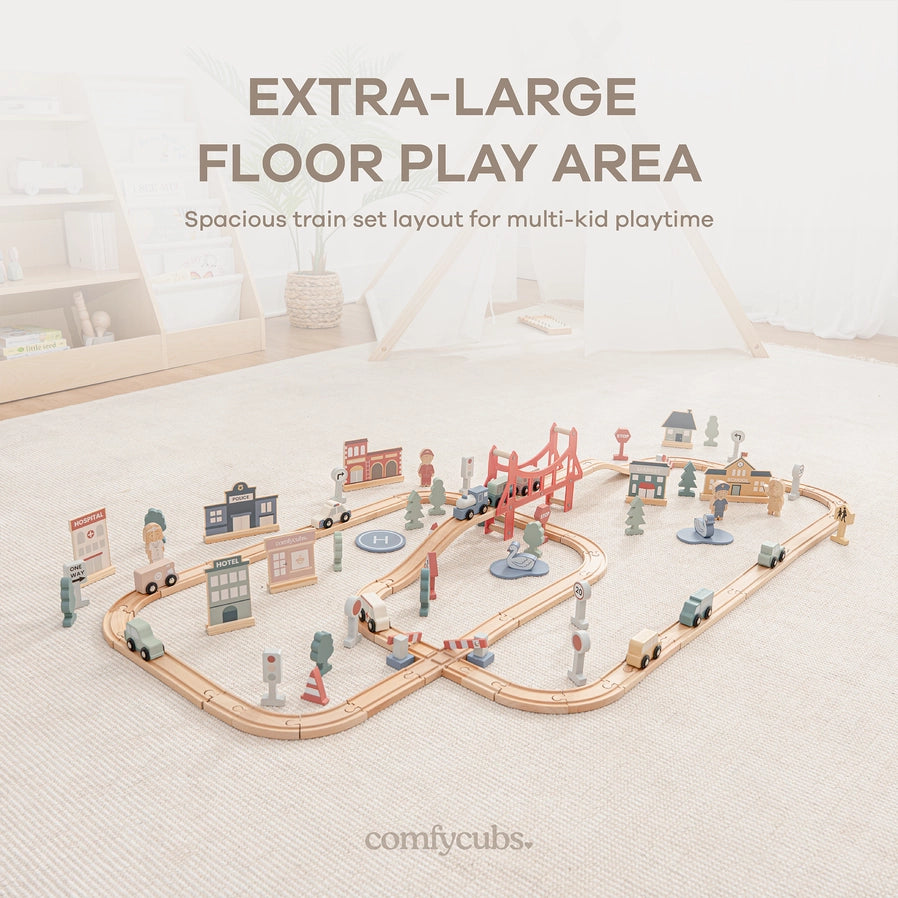 The Comfy Cubs train toys set is an engaging toy that provides toddlers a fun way to explore hands-on play. Designed for children aged 1+, this train set for toddlers features a mix of wooden tracks, trains, and town-themed accessories that can be arranged in many different ways. Our toy train sets are easy to set up, gentle to handle, and just the right size to introduce little ones to imaginative building.