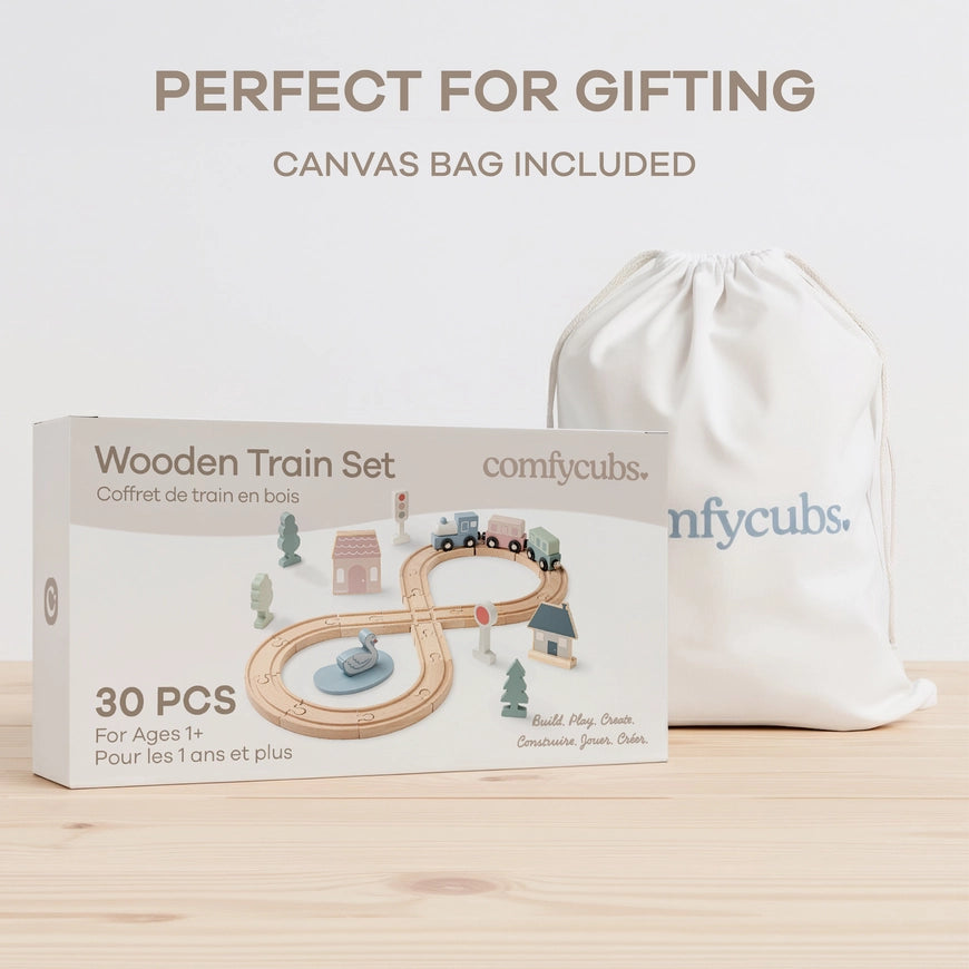 The Comfy Cubs train toys set is an engaging toy that provides toddlers a fun way to explore hands-on play. Designed for children aged 1+, this train set for toddlers features a mix of wooden tracks, trains, and town-themed accessories that can be arranged in many different ways. Our toy train sets are easy to set up, gentle to handle, and just the right size to introduce little ones to imaginative building.