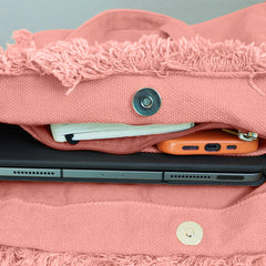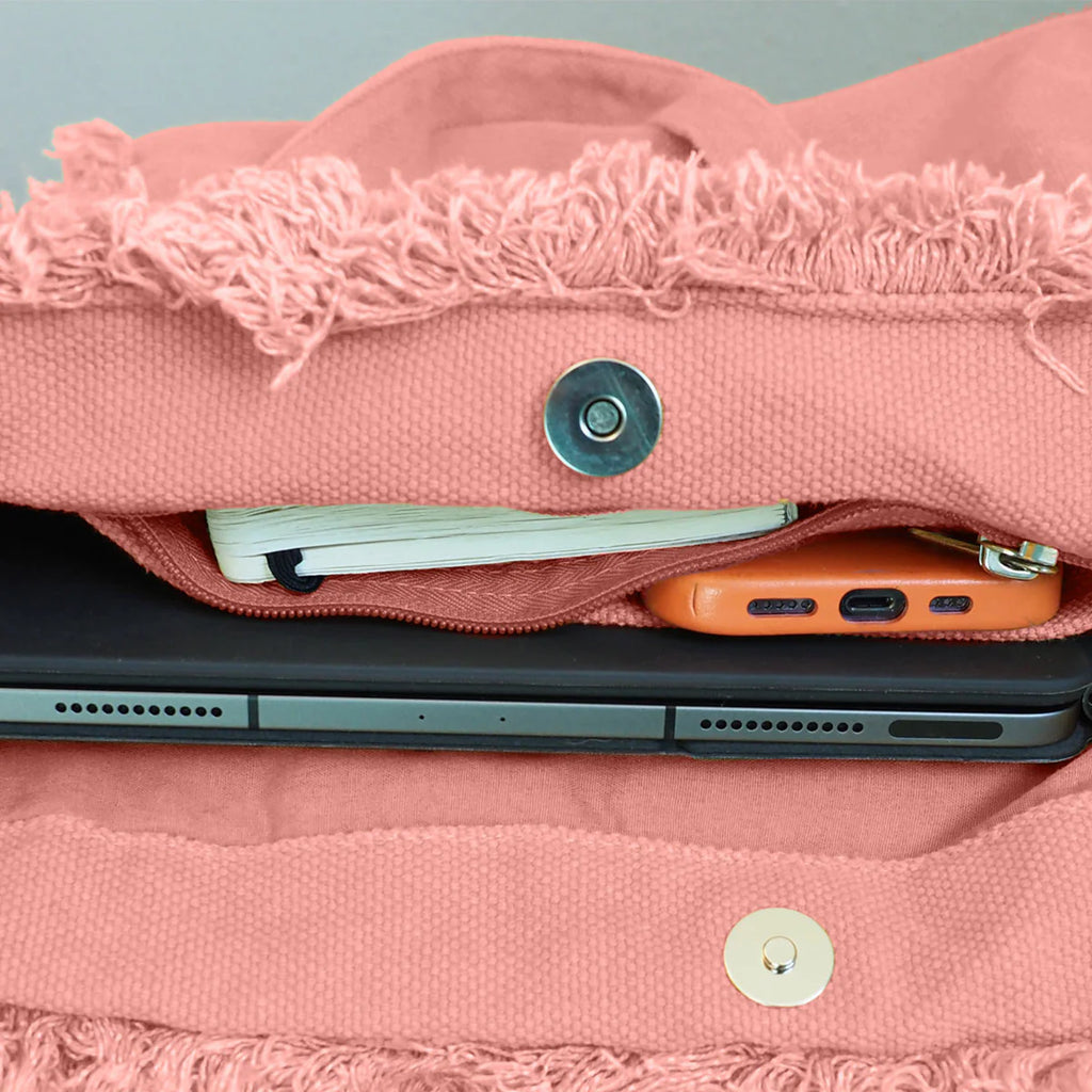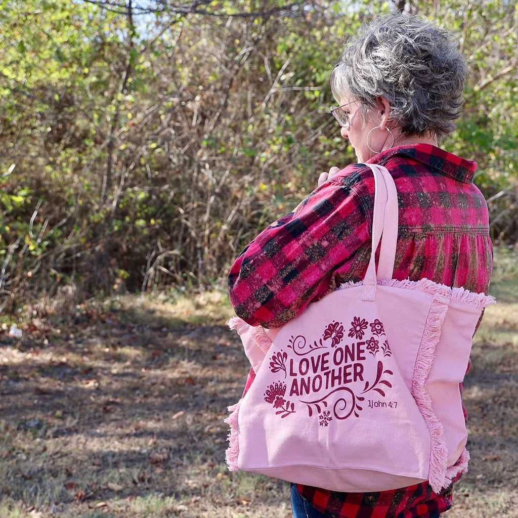 This durable fringed canvas Love tote bag lets you carry a message of faith with you wherever you go! A removable bottom plate adds structure and shape. This pretty + practical tote bag includes two inner pockets—one securely zippered, and one open for easy access to your phone and keys.