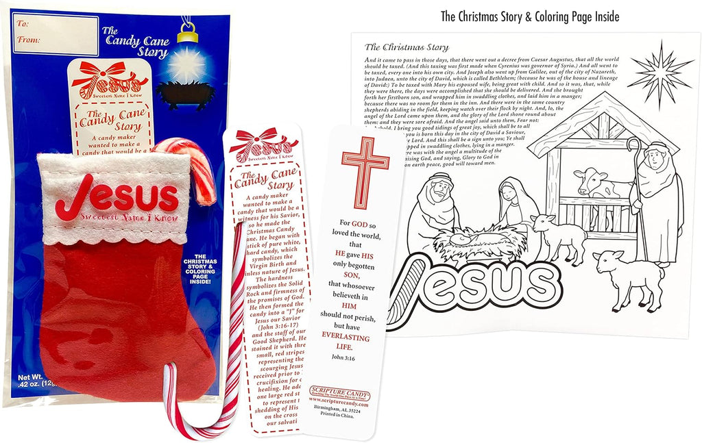 Each stocking set contains a "true" candy cane, a bookmark featuring "The Candy Cane Story," and a coloring page inside.
