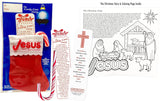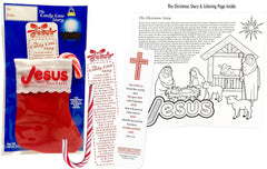 The stocking is just the right size for placing a gift card inside. With the "To" and "From" printed gift tag at the top of the package, it makes a quick and easy gift. Each set has a nativity scene to color, featuring "The Christmas Story", a bookmark, a candy cane and a mini stocking.