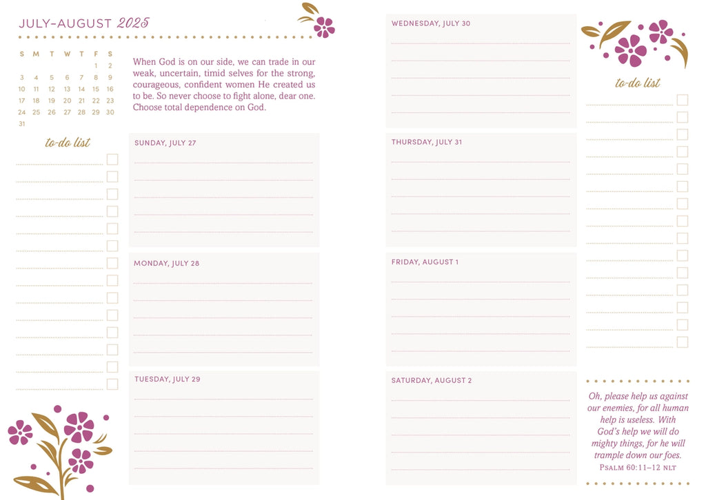 Ideal for personal, home, business, or school use, the Daily Wisdom for Women planner includes inspiring monthly full-length devotions plus weekly, thought-provoking mini devotions and scripture selections. Featuring monthly and weekly calendars, a year-at-a-glance section, pages for frequent contacts, and more, this planner offers an important reminder as you organize your days: God is in the details. . .and His plan is perfect!