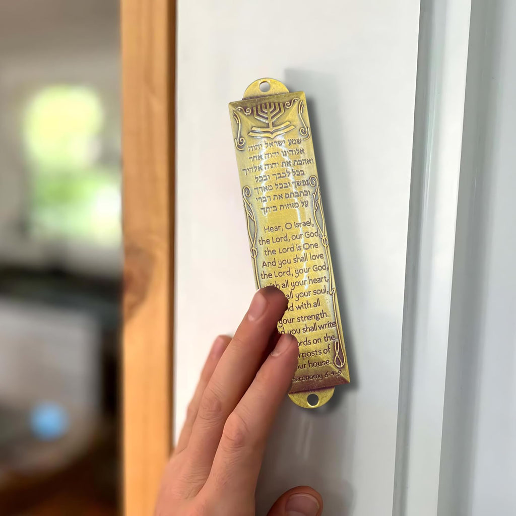 This piece goes beyond a typical messianic siddur, incorporating visual elements rich in meaning. The top features a menorah 7-branch design, a powerful symbol in Jewish tradition. Crafted as a brass plaque, it offers durability and a refined aesthetic. More than just a shalom sign, this mezuzah represents a connection to cultural roots and spiritual values, making it a treasured addition to any Jewish home.