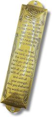 Brass plated cast metal Shema Blessing Mezuzah -Shema prayer in Hebrew and English -Menorah design top -Includes Mezuzah parchment scroll -5.5 inches tall
