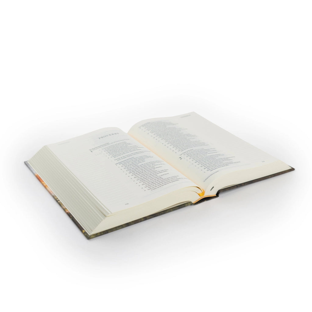 Product Details - Translation: English Standard Version (2025) - Format: Cloth-over-board hardcover - Page layout: single column, 2" lined journaling margins - Cream-colored Bible paper - Two satin ribbon markers - Smyth-sewn binding - Jesus's words in black - Font size: 8pt - Page count: 1,450 - Dimensions: 8.75” x 6.625” x 1.75” - Weight: 42oz