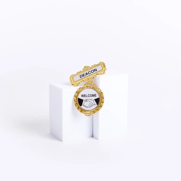 This beautifully designed, golden “Deacon” Badge is the ideal accessory for Church services and events where clear identification is essential. Featuring a top bar with intricate scrollwork edges, it adds an elegant and professional touch to any attire. The badge itself is a fancy round design, delicately engraved to create a timeless and polished appearance that enhances the wearer’s role.