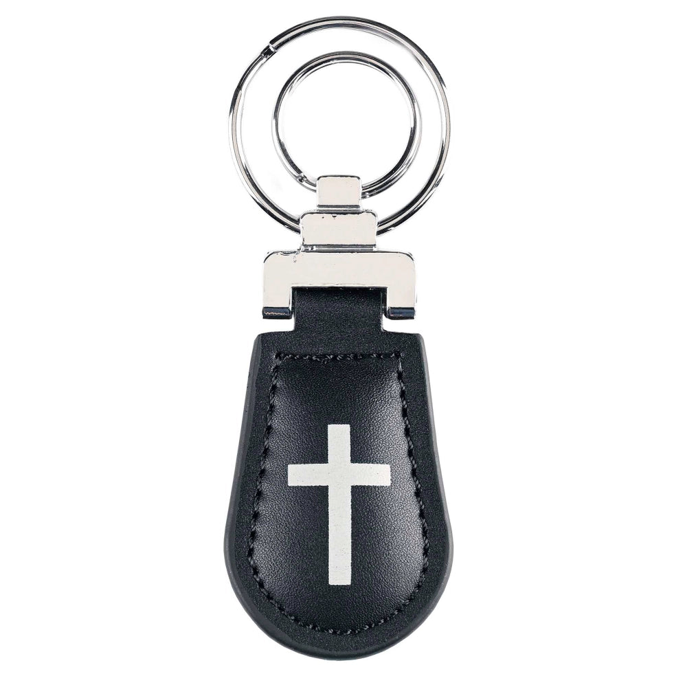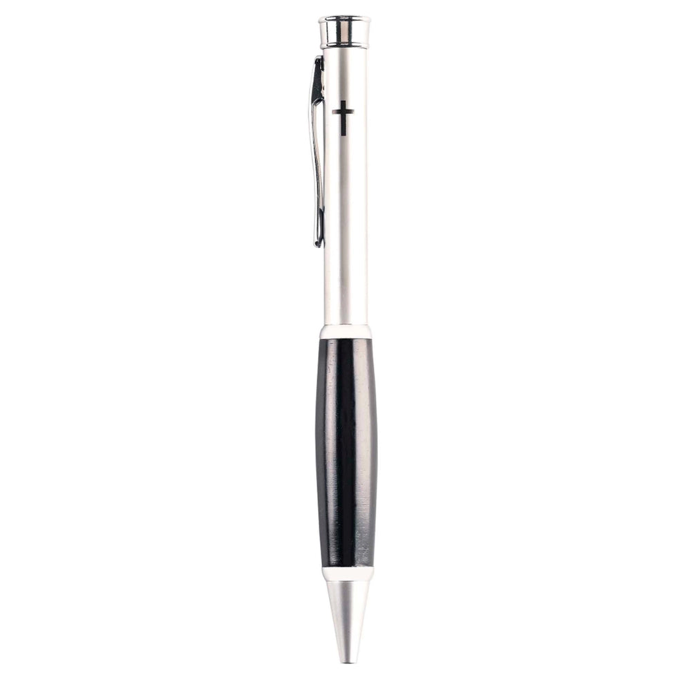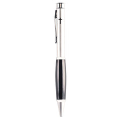 Pen has large rounded lower barrel that twists to release/retract the pen point. Ink is black. Keyring has black leatherette fob with silver cross emblem and Eph. 6:13-17 verse reference. Pieces fit securely in the specially cut.