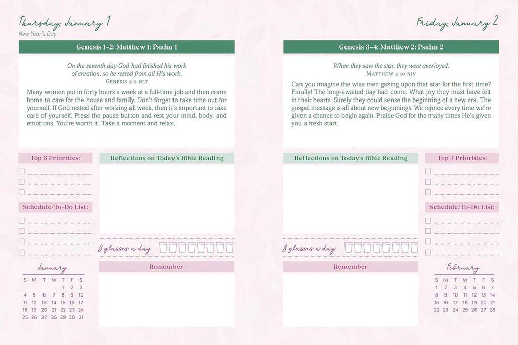 Add to that a daily Bible verse and short devotional thought taken from that day’s scripture, you will have space to write your reflections, keeping a year’s worth of insights from God’s Word!