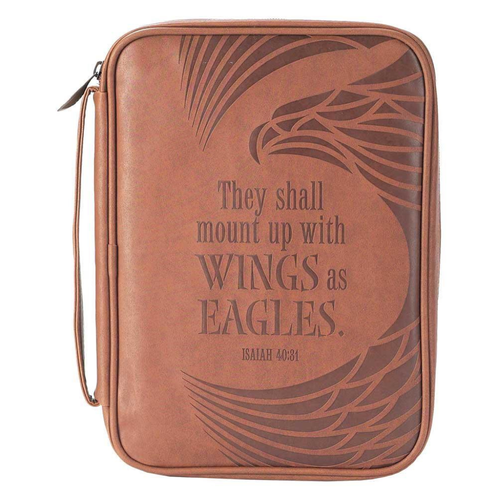 This leather-like Bible cover has thermal imprint design featuring abstract eagle and the words "They shall mount up with wings as eagles" from Isaiah 40:31.Β